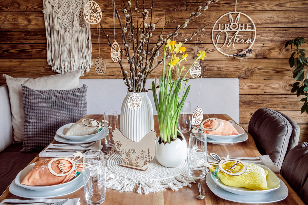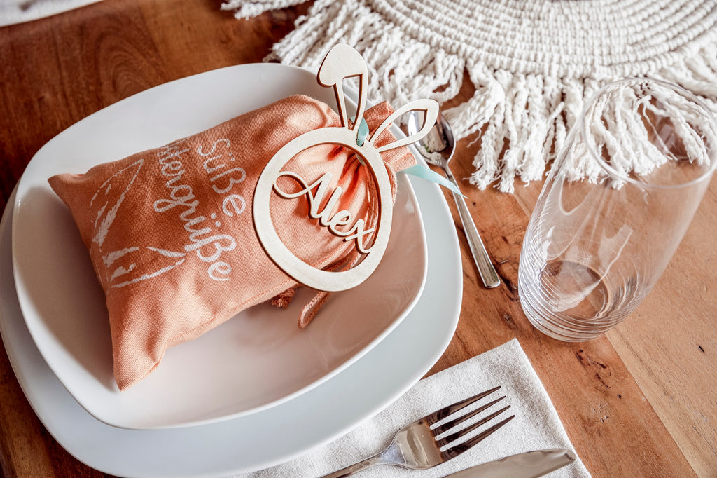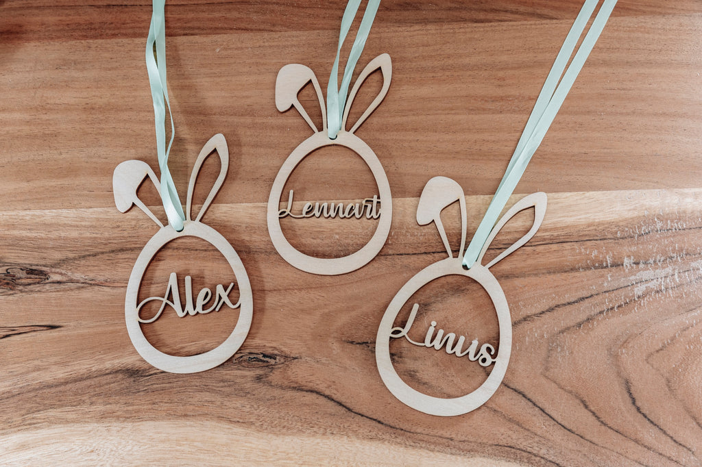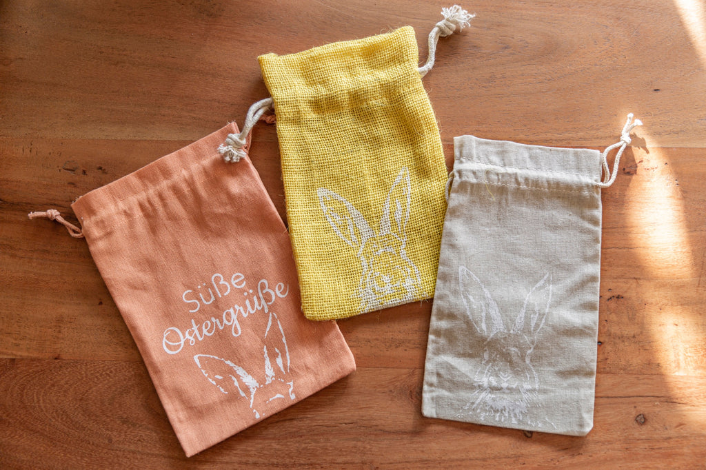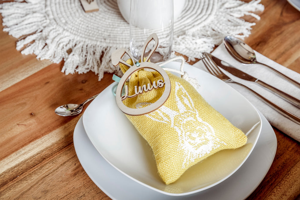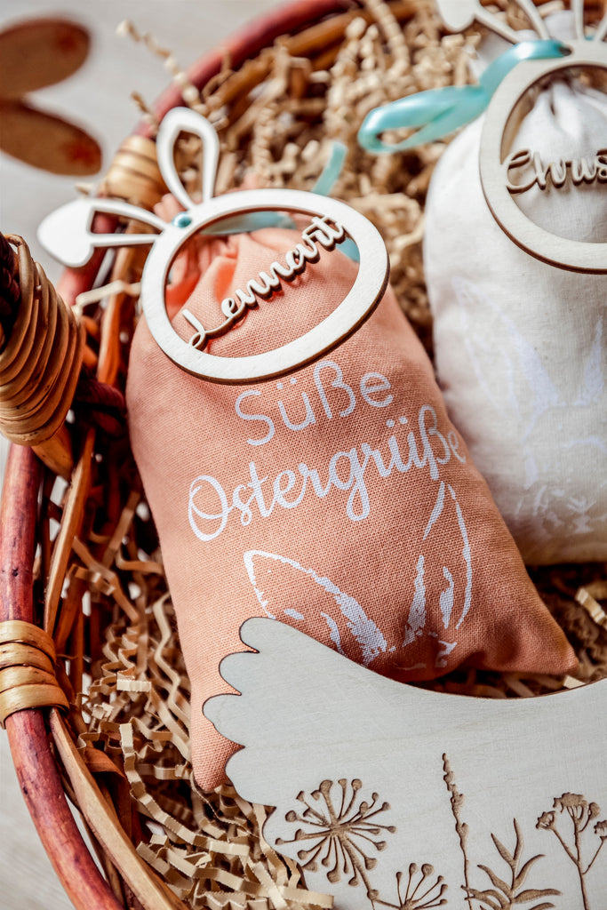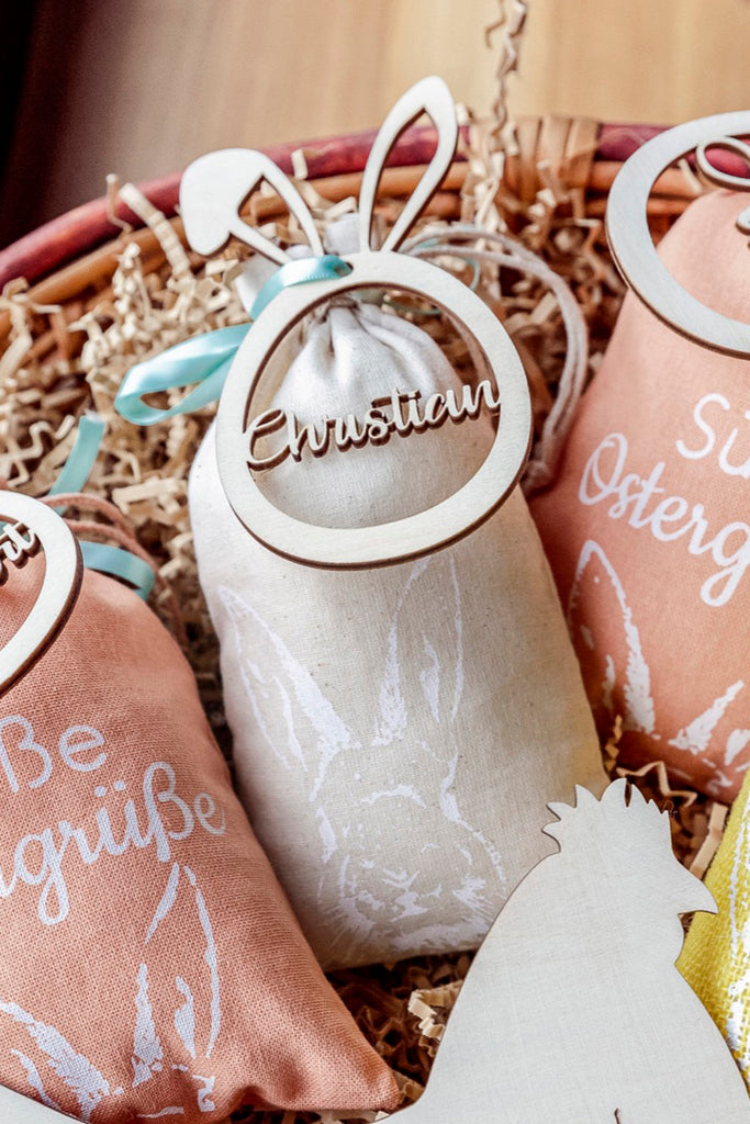 Süße Osterbeutel mit personalisierten Namensanhänger aus Holz in drei frischen Frühlingsfarben. Tolles Ostergeschenk für Groß und Klein! Auch als Dekoanhänger für Weidenkätzchen oder andere Aufhängmöglichkeiten zu verwenden.