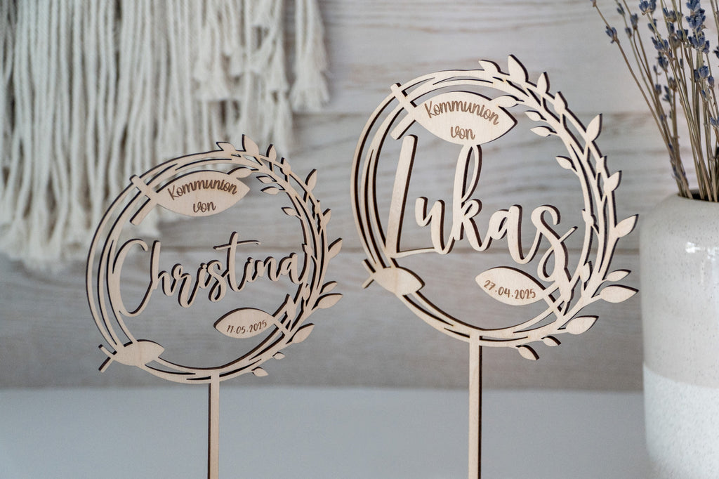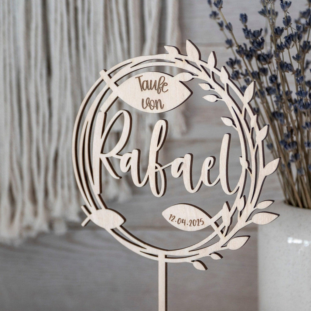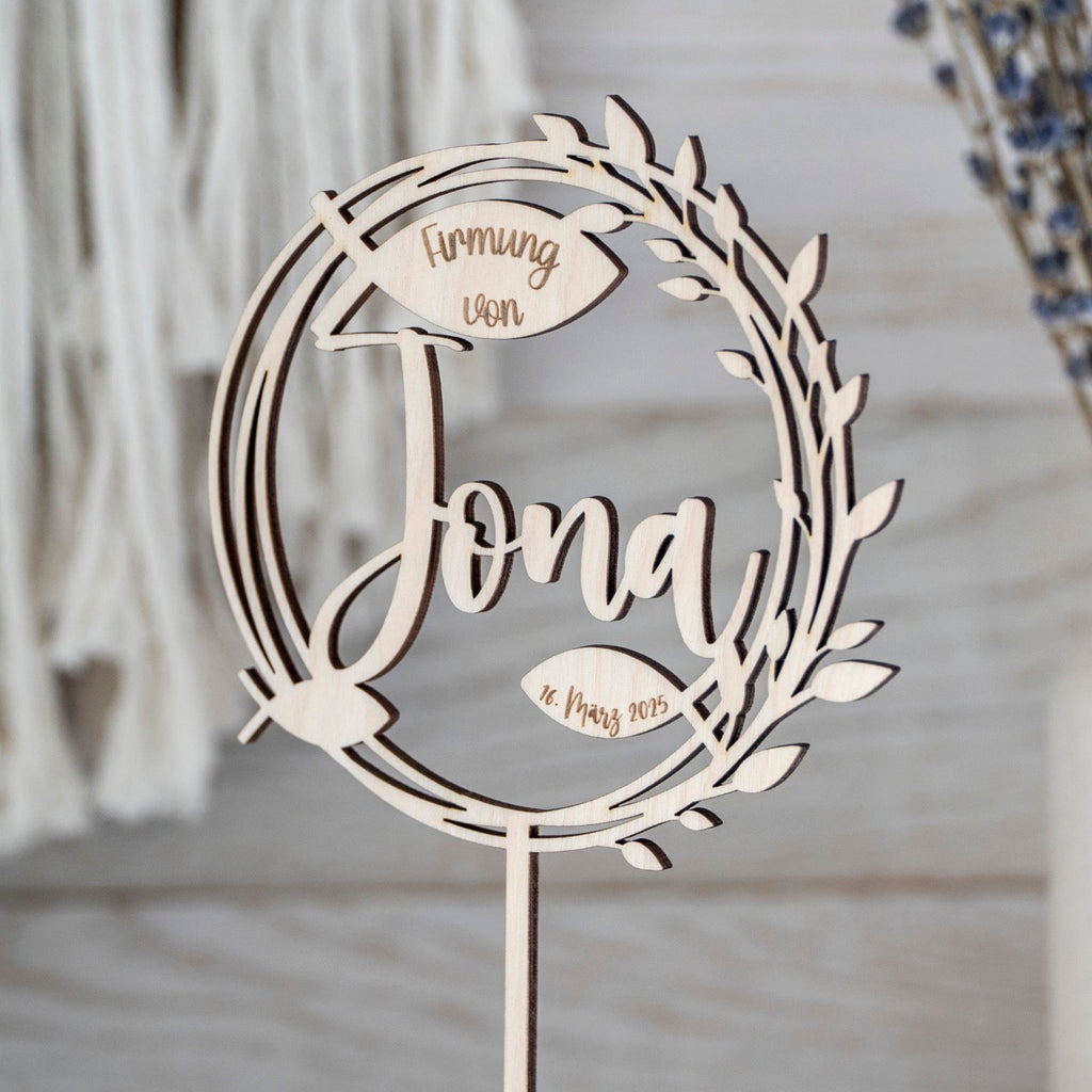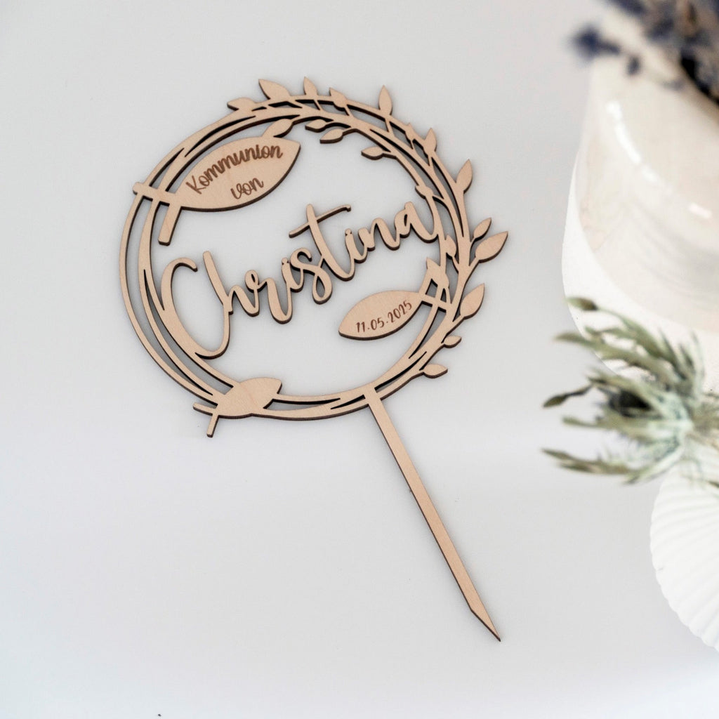 Verleihe deiner Feier einen besonderen Glanz mit unserem Cake Topper Kommunion aus Holz! Dieser stilvolle Tortenstecker wird individuell mit Name und Datum personalisiert und ist die perfekte Ergänzung für deine Torte zur Kommunion, Konfirmation, Firmung oder Taufe. Das elegante Design mit dezenten Fischen unterstreicht die Bedeutung des Anlasses und sorgt für einen einzigartigen Blickfang.