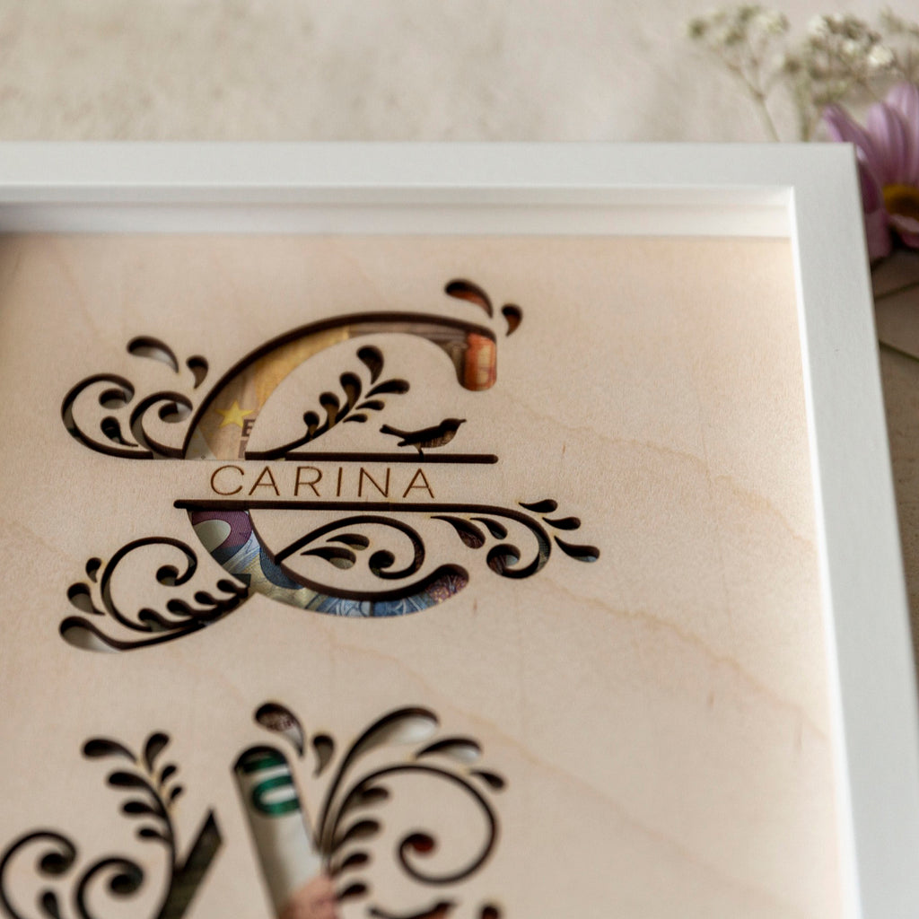 Ein ideales Geschenk zur Hochzeit. Auch nachdem das Geld herausgenommen wurde, kann es wunderbar als Dekoration mit einem Bild dahinter verwendet werden. Möglich ist es auch, den Rahmen mit einer einzeiligen Gravur der Schenkenden zu gravieren (s Geldgeschenk Weltkarte).