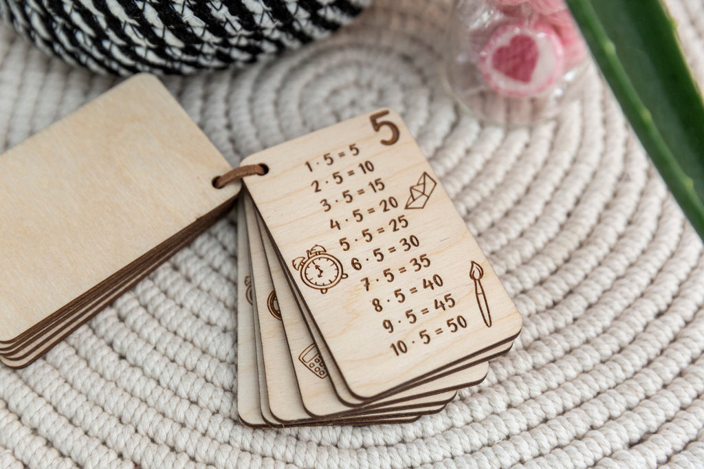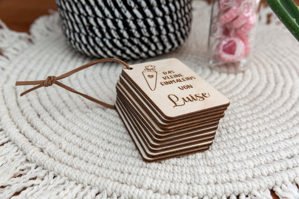 Der Einmaleins-Fächer ist eine kompakte Lernhilfe mit dem kleinen Einmaleins von 1–10 auf zehn handlichen Holzkarten. Eine zusätzliche Deckblatt-Karte mit dem Namen des Kindes sorgt für eine persönliche Note. Zur schnellen Orientierung ist jede Karte oben rechts mit der jeweiligen Zahl versehen. Zusammengehalten werden die Karten von einem weichen Wildlederband.