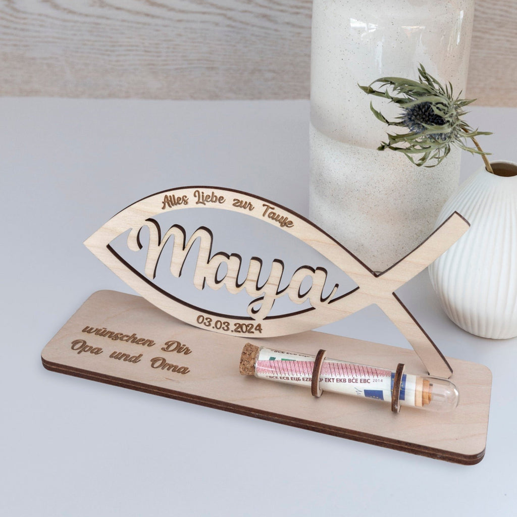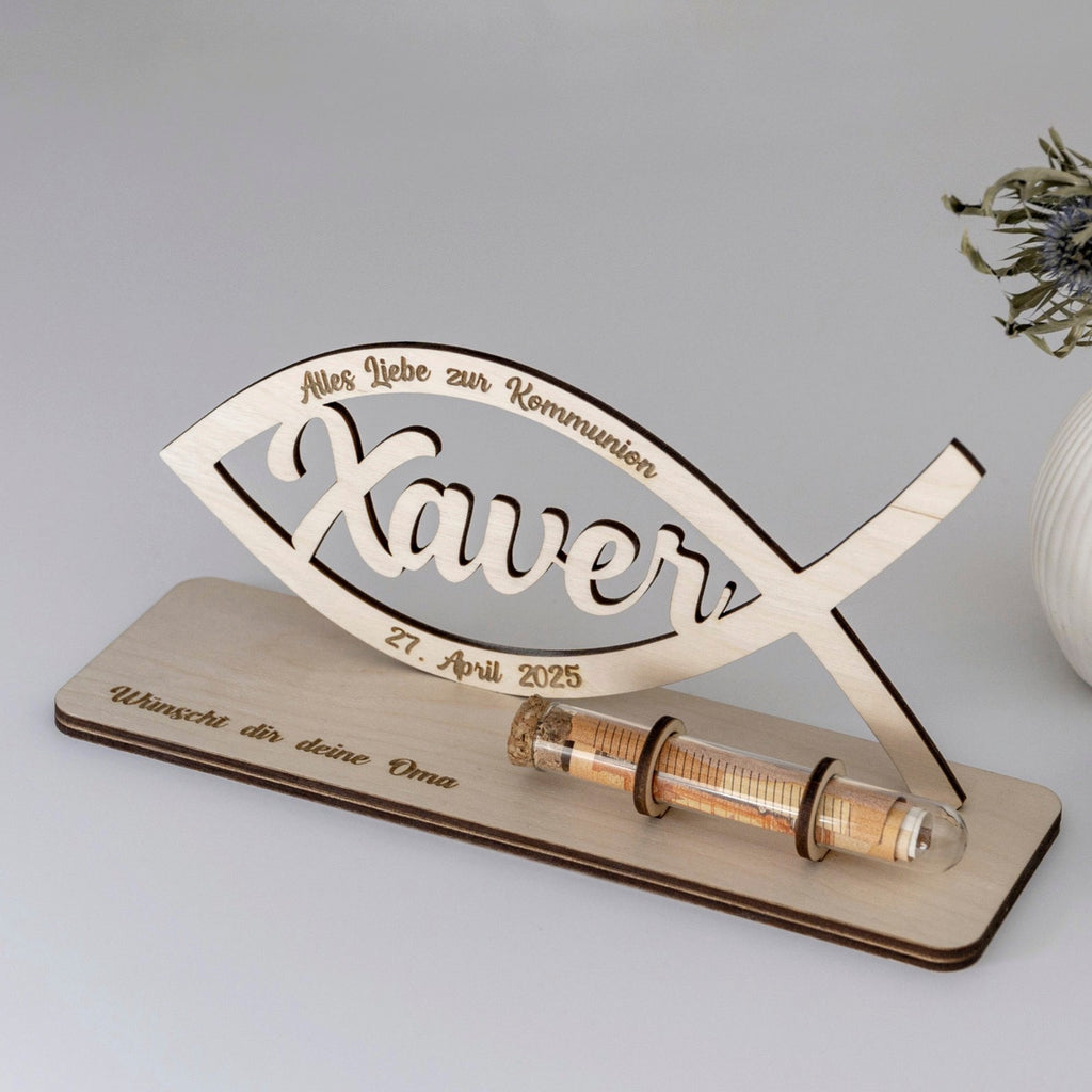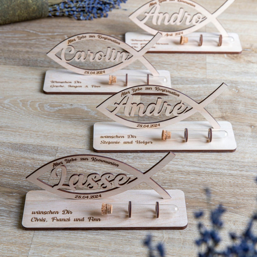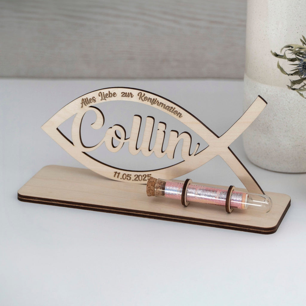 Schöne Geschenkidee für Kommunion, Konfirmation, Firmung oder Taufe mit Personalisierung und Reagenzglas zur Aufbewahrung für das Geld. Der Sockel wird nach den Wünschen graviert, im Fisch ist der Name der zu beschenkenden Person ausgeschnitten und unten im Fisch kann noch ein Datum platziert werden.
