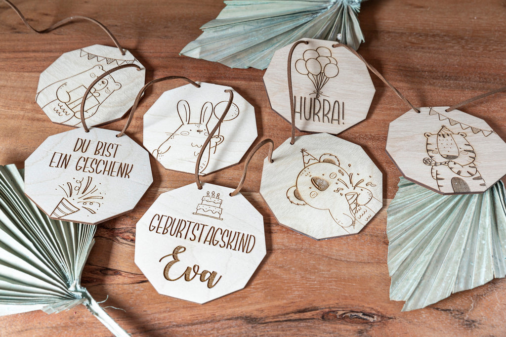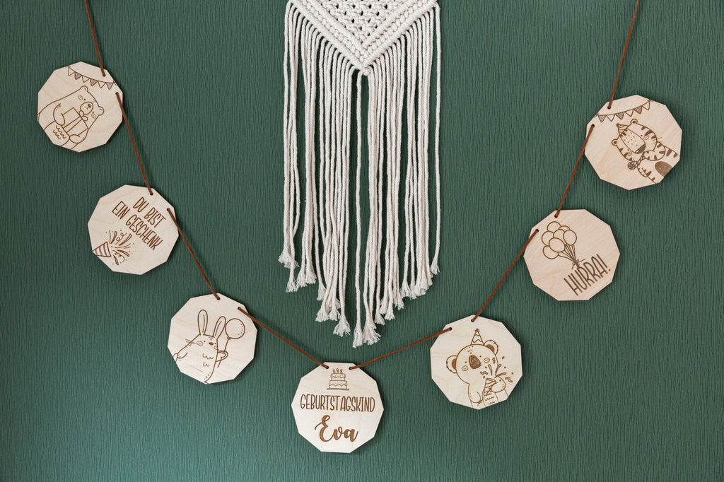 Eine süße Geburtstagsgirlande für Kinder, mit 7 Schildern, eines davon personalisiert mit dem Namen des Kindes. Tolle Deko für jeden Kindergeburtstag! Auch eine schöne Geschenkidee.